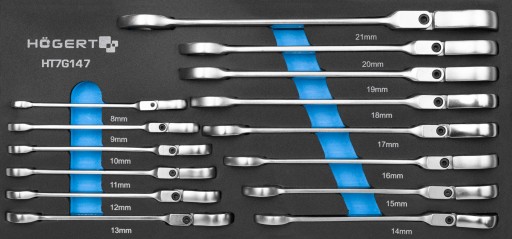 Klucze płasko-oczkowe z przegubem: HT1R048 (8 mm), HT1R049 (9 mm), HT1R050 (10 mm), HT1R051 (11 mm), HT1R052 (12 mm), HT1R053 (13 mm), HT1R054 (14 mm), HT1R055 (15 mm), HT1R056 (16 mm), HT1R057 (17 mm), HT1R058 (18 mm), HT1R059 (19 mm), HT1R060 (20 mm), HT1R061 (21 mm).