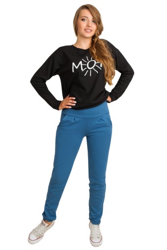 Zastosowany panel jest bardzo przyjazny dla brzuszka- nie posiada z przodu gumy- ma ją zaś na tyle, co sprawia, że spodnie nie uciskają, ale ładnie trzymają się na sylwetce.