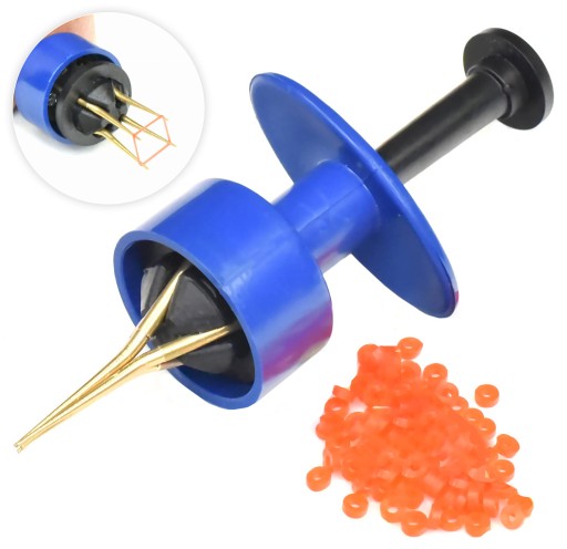 Bardzo przydatny przyrząd do zakładania gumek lateksowych na przynęty wędkarskie np. pellet Sprawdzi się także podczas pęczkowania przynęt żywych - ochotka, białe robaki, itp. Przyrząd do nakładania gumek na ziarna kukurydzy i pelletu przy łowieniu "na włos". Wystarczy nałożyć gumkę na 4 pręciki, nacisnąć przycisk aby rozszerzyć gumkę i włożyć pellet do środka.