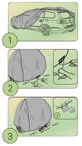 - Pokrowiec założyć na czysty samochód stroną pokrowca z nadrukiem na zewnątrz.