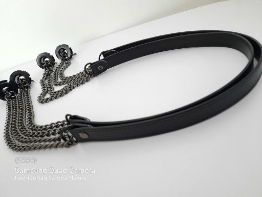 Czarny pasek z czarnym łańcuszkiem i czarnymi okuciami metalowymi