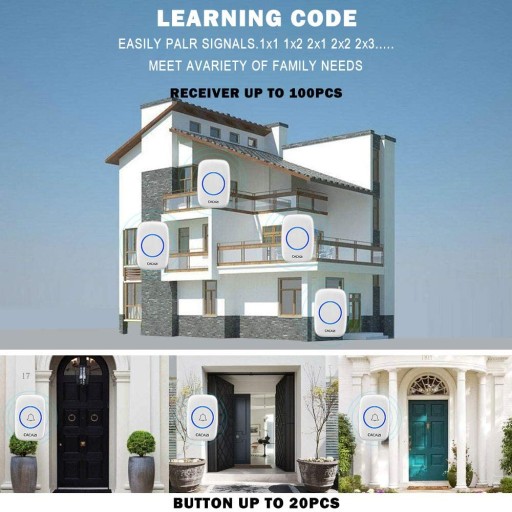 Możliwość samodzielnej rozbudowy i niskie zużycie energii: Możesz rozszerzyć każdy nadajnik o maksymalnie 10 odbiorników. Funkcja uczenia kodu ułatwia dostosowanie dzwonka do drzwi za pomocą wielu nadajników i odbiorników. Zasilany baterią 23 A 12 V, nadajnik jest testowany, aby zapewnić do 10 000 razy prasy do codziennego użytku, eliminując potrzebę częstej wymiany baterii.