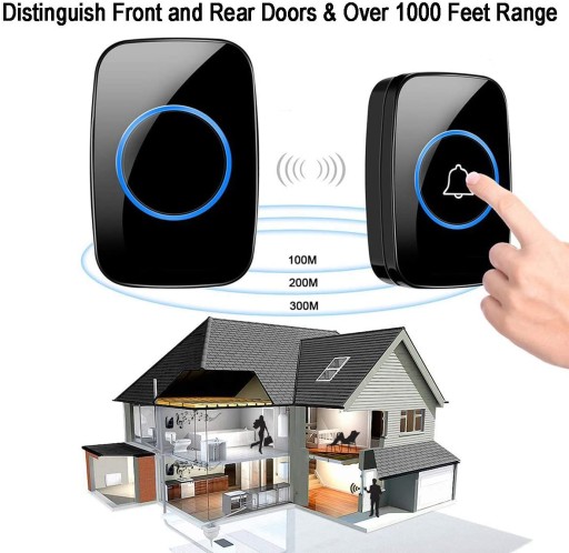 Daleki zasięg Do 1000 stóp (300 m) na otwartej przestrzeni: upewnij się, że nigdy nie przegapisz ważnych gości ani pilnych dostaw, nawet jeśli znajdujesz się w odległości kilku pokoi. Ten bezprzewodowy dzwonek doskonale sprawdza się w kuchni, sypialni, salonie i tak dalej.