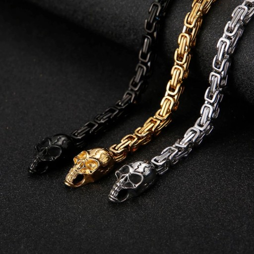 Oferujemy Państwu ekskluzywną, dystyngowaną biżuterię w postaci oryginalnej zawieszki marki GINARO Vikings Collection wykonanej z wysokiej jakości stali szlachetnej 316L, będącej światowym hitem sprzedaży w branży jubilerskiej. Zawieszka z motywem Młota Thora, idealna dla miłośników Vikingów z pewnością doskonale nada się jako wysublimowany dodatek do garderoby. Naszyjnik o wysokim połysku na cenionym splocie Królewskim o szerokości 6 mm, zwieńczony detalami na wizerunek czaszek, które stanowią również formę zapięcia. Elementy stalowe, w kolorze starożytnego srebra posiadają wypukłości i wgłębienia, które sprawiają, że wzorzysta faktura prezentuje się bardzo oryginalnie. Miejscami pokryta jest kolorem czarnym, dzięki czemu detale są bardzo efektowne.