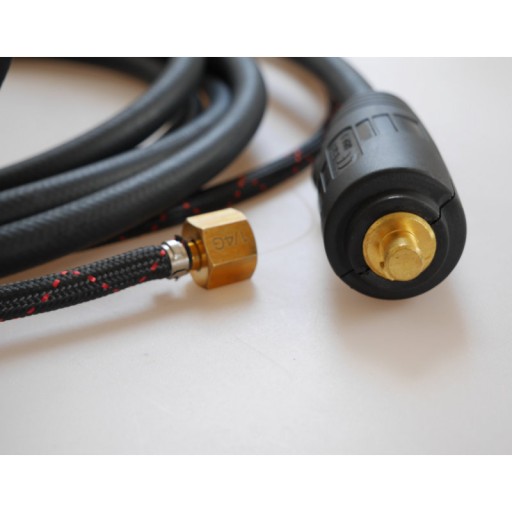 Uchwyt TIG zakończony jest nakrętką, którą w niektórych spawarkach można wkręcić bezpośrednio w spawarkę ( gaz plynie wtedy bezpośrednio ze spawarki). Jeśli twoja spawarka nie ma takiego wyjścia, w zestawie znajdziesz złaczkę, którą połączysz przewód gazowy z wężem gazu, a ten wepniesz do butli z gazem.