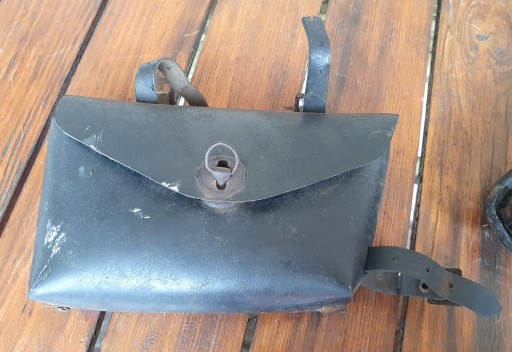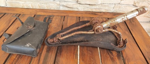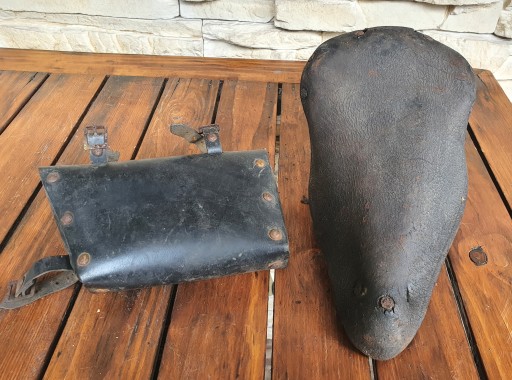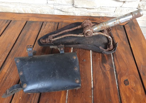 Oferuję komplet, w skład którego wchodzą części od zabytkowego roweru - siodełko oraz torba rowerowa.