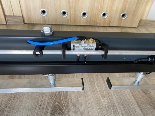 Belkę dostosujemy ją do każdego rodzaju formatówki, prezentowana na zdjęciach została wykonana do pilarki Rema FX 500, długość stołu 3200 mm. Listwa dociskowa dzielona na 2 strefy docisku 950mm przy liniale i 1670mm, sterowana niezależnie, wygodna w obsłudze.