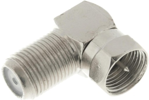 Przejście antenowe z gniazda typu F na wtyk F pod kątem 90 stopni, metalowe toczone.