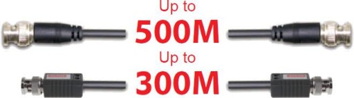 Transmisja sygnału w rozdzielczości HD poprzez przewód koncentryczny do 500m, wykorzystując skrętkę komputerową Cat-5e do 300m.