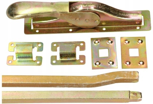 Zasuwa ryglowa baskwilowa góra-dół do drzwi garażowych. Na środku znajduje się zamek, który rozsuwa pręty do góry.