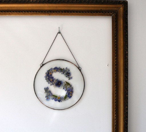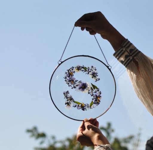 Dekoracyjny witraż z kompozycją z suszonych roślin wykonany w całości w pracowni rękodzieła MARIAELA.