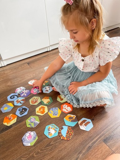 Zabawa polega na dopasowywaniu par kafelków z tymi samymi zwierzętami – część kafelków pokazuje koty w całości, a część tylko fragmenty ich ciała. Dzieci ćwiczą w grze pamięć, koncentrację i spostrzegawczość. Ze względu na proste zasady memory sprawdzi się także w zabawach z młodszymi przedszkolakami.