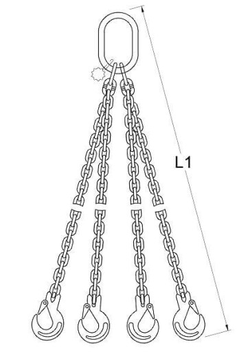 Zawiesie łańcuchowe 4-cięgnowe z ogniwem zbiorczym + HAKI SKRACAJĄCE zakończone hakami z zapadką