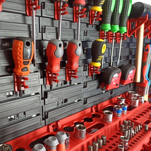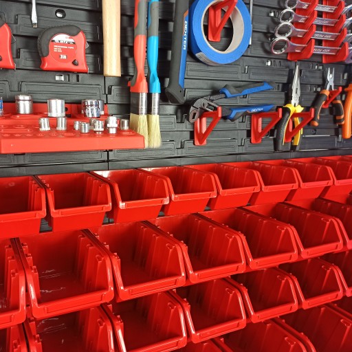 Tablica narzędziowa ORDERLINE do zawieszenia na ścianie, uniwersalna i przydatna w każdym garażu czy warsztacie. W komplecie 10 tablic montażowych o łącznych wymiarach 193 cm na 78 cm, 77 pojemników, zestaw praktycznych uchwytów i półek do narzędzi. Łatwy montaż pojemników na tablicy pozwala na ich dowolne przemieszczanie w zależności od potrzeb. W każdej chwili można też pojemnik zdjąć, by uzyskać dostęp do zawartości.