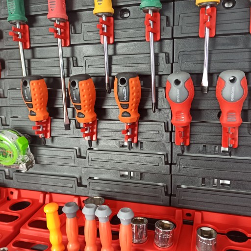 - W zestawie 77 sztuk kuwet, zestaw uchwytów do narzędzi (w sumie 40 sztuk), 2 półki oraz 10 tablic ściennych 386 mm x 390 mm (po złączeniu 193 cm x 78 cm)
