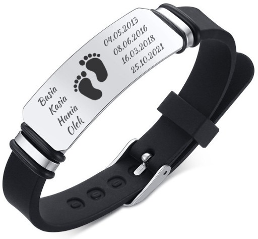 Spersonalizuj swoją bransoletkę umieszczając na blaszce ze stali chirurgicznej najważniejsze dla Ciebie informacje, takie jak: imiona dzieci, rocznicę ślubu, datę urodzin, wyznanie miłości... oraz wybierz jedną z niepowtarzalnych grafik i w ten sposób wyraź swoje uczucia. Można stworzyć bransoletkę, która naprawdę zatrzyma wspomnienia. Najwyższa jakość wykonania, kauczukowy pasek, stal 316L i te imiona! daty!