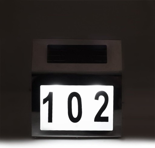 - PODŚWIETLENIE ZASILANE SŁONECZNIE I CZUJNIK ZMIERZCHU – panel słoneczny ładujący znajdującą się w zestawie baterię akumulatorową, która zasila 2 wydajne LED-y sprawia, że numer jest dobrze widoczny wieczorem i wczesnym rankiem; uruchomienie oświetlenia reguluje czujnik zmierzchu, który reaguje na zmianę natężenia padających promieni świetlnych.