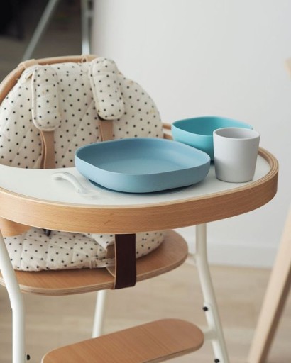Wyższe boki miseczki i talerzyka ułatwiają dziecku samodzielne nabieranie posiłku na widelec czy łyżkę.