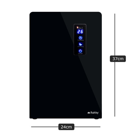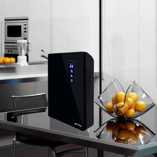Osuszacz powietrza posiada przejrzysty, prosty w obsłudze, dotykowy panel sterowania z podświetleniem LED w kolorze niebieskim. Dzięki wbudowanemu termometrowi oraz higrometrowi podczas pracy pokazuje aktualną temperaturę na przemian z aktualną wilgotnością powietrza otoczenia w jakim się znajduje.