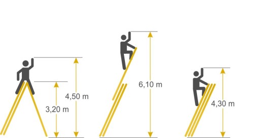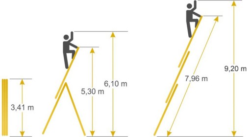 Ponadto masz możliwość rozłożenia drabiny na schodach i pochyłościach terenu. Przy stosunkowo niewielkich wymiarach transportowych (3,41 m) sięgniesz z niej do wysokości ok. 9,20 m.