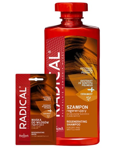 RADICAL® to prawdziwy przełom w pielęgnacji oraz walce z wypadaniem włosów. Ekstrakt ze skrzypu polnego wzmacnia włosy. Proteiny to niezbędny element w ich pielęgnacji, pełniący rolę regenerująco-naprawczą. Zastosowanie emolientów pozwala wygładzić łuski włosa i zamknąć w nim dobroczynne składniki na dłużej. Dzięki dwóm etapom kuracji, włosy w odpowiedniej kolejności są wzbogacane o najcenniejsze dla nich składniki.