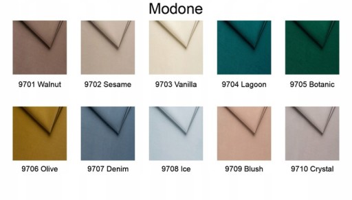 Modone to tkanina velvetowa, charakteryzująca się miękką i przyjemną w dotyku strukturą. Za efekt wizualny odpowiadają tutaj pastelowe kolory. Tkanina charakteryzuje się do dobrą odporność na pilingi oraz zwiększoną odporność na zadrapania i zaciągnięcia zwierzęcych pazurów, dzięki czemu zaliczona została to materiałów Pet friendly. Ponadto materiał wykonany został w technologii Easy Clean. Formuła ta ułatwia utrzymanie tkaniny w czystości i usuwanie ewentualnych plam.