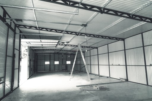 Garaż blaszany 20x7m o podwyższonej, dodatkowo wzmocnionej konstrukcji z czterema bramami uchylnymi wyposażonymi w automaty, otworami na okna oraz furtką.