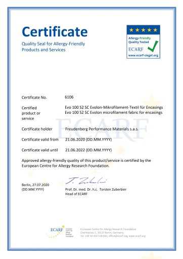 Evolon® został nagrodzony niezależnym znakiem jakości Fundacji Europejskiego Centrum Badań nad Alergiami (ECARF). Ma to na celu pomóc alergikom w wyborze odpowiednich towarów i usług poprzez certyfikowanie jakości produktów i usług zgodnie ze ścisłymi standardami.