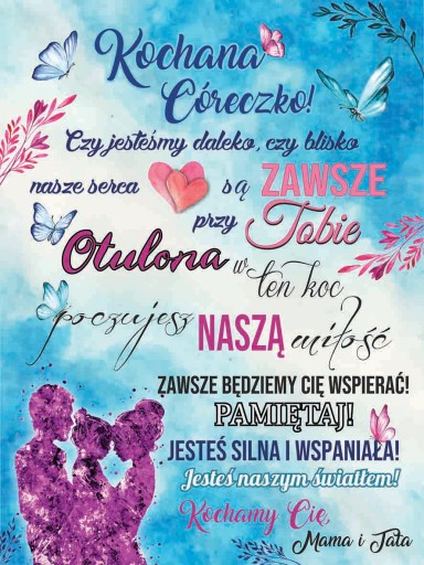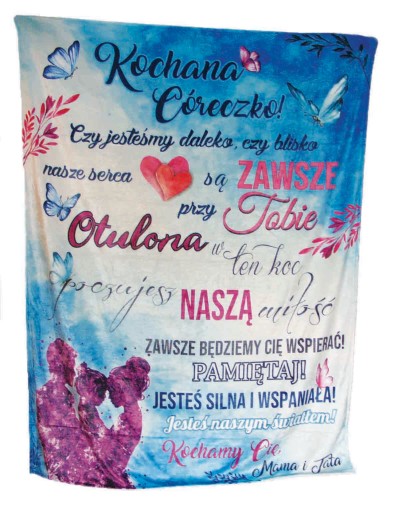 Personalizowany koc 200x150cm ''OD RODZICÓW DLA CÓRKI'' to świetny pomysł na niepowtarzalny i zaskakujący prezent który w chwili obdarowywania jak i po upływie lat wywoła niesamowite emocje