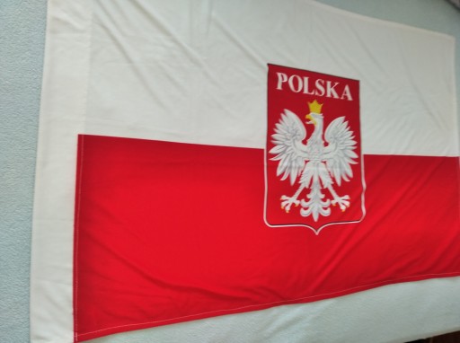 Flaga Polski wymiary około długość 99 cm szerokość 67 cm.