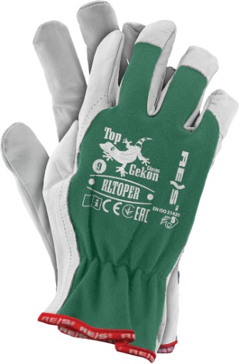 Rękawice ochronne ze skóry koziej licowej RLTOPER marki REIS w kolorze zielono - białym, linia TOPGEKON