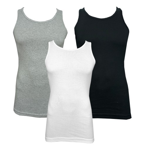 Zestaw zawiera 3 podkoszulki w kolorach przedstawionych na zdjęciu, tj.: biały, szary i czarny.