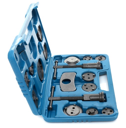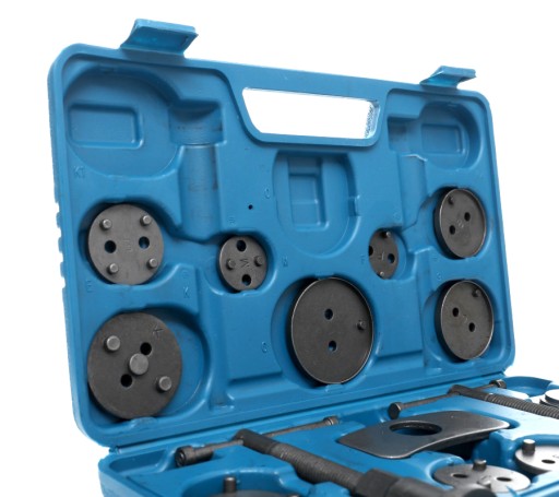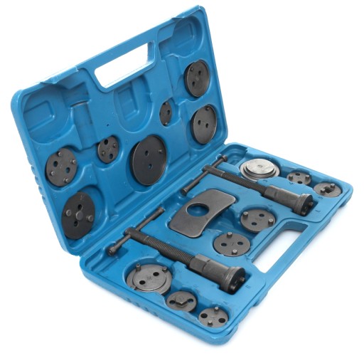Profesjonalny, duży, 18 elementowy zestaw do cofania / wyciskania tłoczków w cylinderkach układów hamulcowych, niezbędny przy naprawach pojazdów wyposażonych w hamulce tarczowe.