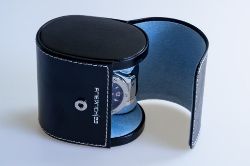 Etui podróżne - skórzane na 1 zegarek "Bond". Czarne. Bardzo dobry jakościowo produkt. Wykonany ręcznie: niezwykle starannie i z wielka dbałością o szczegóły. Made in Germany - Friedrich/23. Nadaje się również na super duże zegarki ( fi 60).