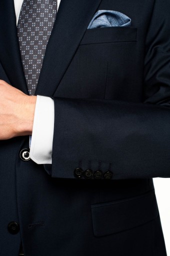 Dwuczęściowy garnitur o kroju regularnym. Gładki deseń, styl klasyczny. Marynarka na podszewce, zapinana na dwa guziczki.