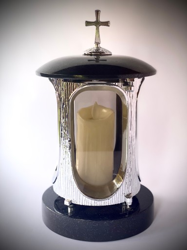 Elegancki Lampion granitowy wykonany z granitu Czarny Szwed I gatunku połączony z chromowanymi elementami ze stali nierdzewnej oraz krzyżykiem.
