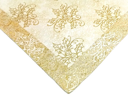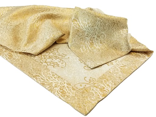 Bogato zdobiony, świąteczny materiał z tkaną złotą nitką sprawia, że nasz produkt jest niepowtarzalny i tematyczny.