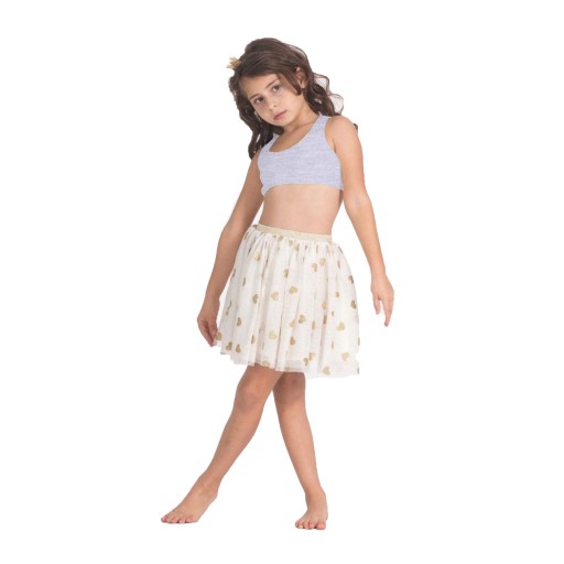 Top dziewczęcy sportowy na grubych/szerokich ramiączkach. Został wykonany z miękkiej w dotyku elastycznej dzianiny. Topik doskonale sprawdza się na ćwiczeniach jako delikatny biustonosz dla małych dam. Bardzo dobrze dopasowuje się do ciała.