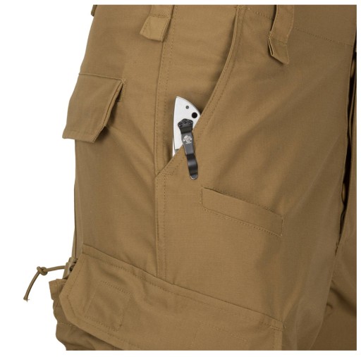 Zestaw 10 praktycznych kieszeni pozwala wygodnie przenosić niezbędne wyposażenie. Szerokie kieszenie udowe z elastycznym ściągaczem są dostosowane do używania ich jako torby zrzutowej na puste magazynki. Nieduże kieszenie na przodzie służą do przechowywania latarki, składanego noża lub zapasowego magazynka. Kieszenie na wysokości łydek mieszczą opatrunek osobisty lub magazynek AR, po które łatwo sięgnąć siedząc w pojeździe.