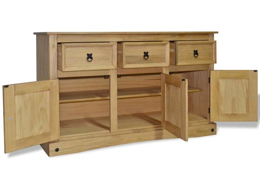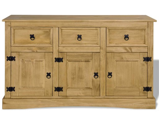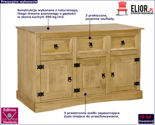 Komoda Gamori została zaprojektowana w niepowtarzalnym stylu "Corona". Woskowana sosna wraz z czarnymi metalowymi detalami emanuje rustykalnym, meksykańskim urokiem, który przełamie wszelkie schematy, jak i rutyny. Mebel ten będzie świetnym dopełnieniem Twojego salonu, jadalni lub przedpokoju. 3 szuflady i szafki zapewnią dużo miejsca do przechowywania wszelkich, nawet niewymiarowych, przedmiotów. Koniec z ciągłym bałaganem oraz zgubionymi drobiazgami! Solidny, przestronny blat idealnie nadaje się do umieszczenia na nim wazonów z kwiatami, roślin doniczkowych, zdjęć oprawionych w ramki lub innych elementów dekoracyjnych. Komoda została w całości wyprodukowana z litego drewna sosnowego przez wykwalifikowanych specjalistów marki Elior. Dzięki temu Gamori może poszczycić się niesamowitą wytrzymałością na wszelkie uszkodzenia mechaniczne i zaplamienia oraz najwyższą trwałością, która będzie trwać przez wiele lat! Zaufaj doświadczonej marce i odśwież swoje wnętrze niepowtarzalnym, meksykańskim klimatem już dziś!