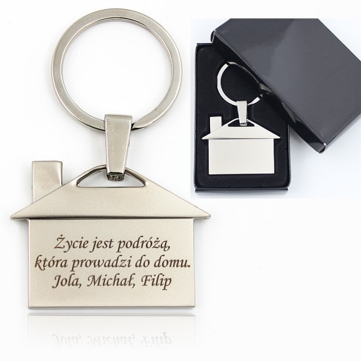 Brelok Metalowy Domek z Grawerem Laserowym Zapakowany w Eleganckie Czarne Pudełeczko.