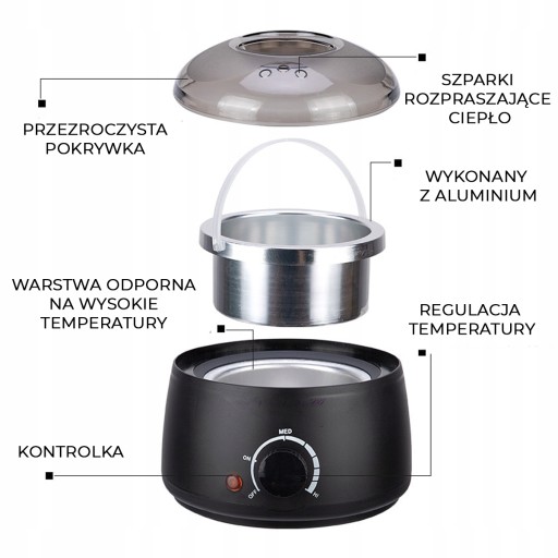 Posiada regulację temperatury podgrzania. Dzięki swojej technologii szybko rozgrzewa wosk i utrzymuje go w stałej temperaturze.