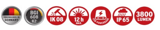 - Czas świecenia do 12h, czas ładowania ok. 5h.