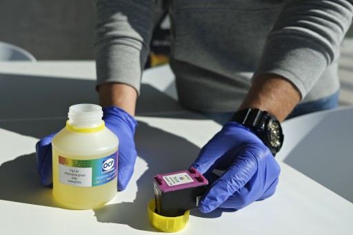 - w przypadku poważnych zanieczyszczeń pomoże wstrzyknięcie niewielkiej ilości płynu na powierzchnię dysz za pomocą strzykawki i odczekanie kilku minut, by płyn rozpuścił złogi atramentu.