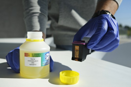 - w przypadku lekkich zanieczyszczeń: nasącz papierowy ręcznik płynem, postaw na nim kartridż dyszami zwrócony do podłoża i odczekaj od 15 minut do 2 godzin.