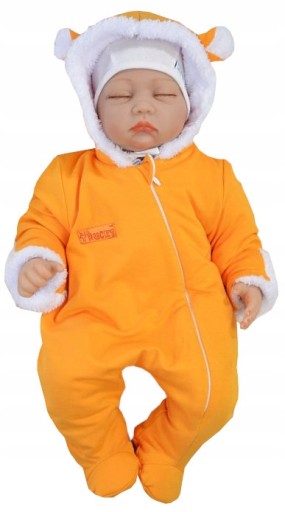 Krój: Pajacyk z kapturkiem i wesołymi uszkami. Zapinany na wygodny zamek od jednej nóżki pod samą szyję. Na końcu zamka przy szyi materiałowe zabezpieczenie, żeby nie uszczypać buzi dziecku ;-) W rękawkach wywijane rękawiczki.
