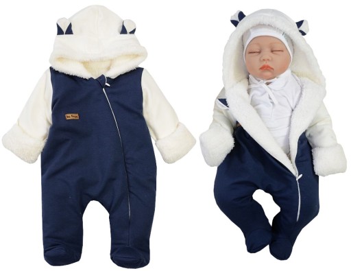 Krój: Pajacyk z kapturkiem i wesołymi uszkami. Zapinany na wygodny zamek od jednej nóżki pod samą szyję. Na końcu zamka przy szyi materiałowe zabezpieczenie, żeby nie uszczypać buzi dziecku ;-) W rękawkach wywijane rękawiczki.