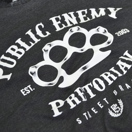 ✅ Jeden z mocniejszych wzorów w klimacie ulicznym z najnowszej kolekcji Pretorian z hasłem Public Enemy i motywem kastetu widocznym na froncie i karku koszulki.