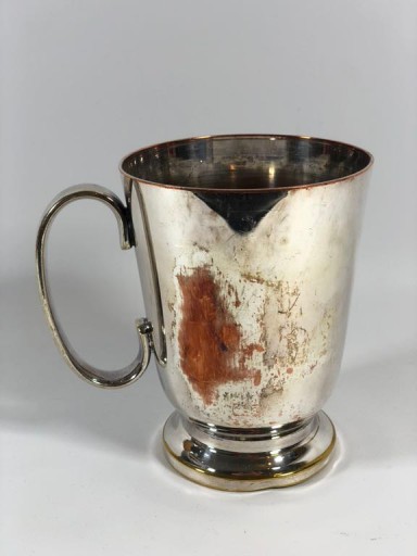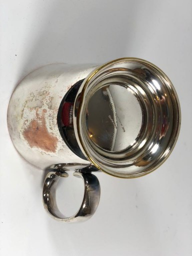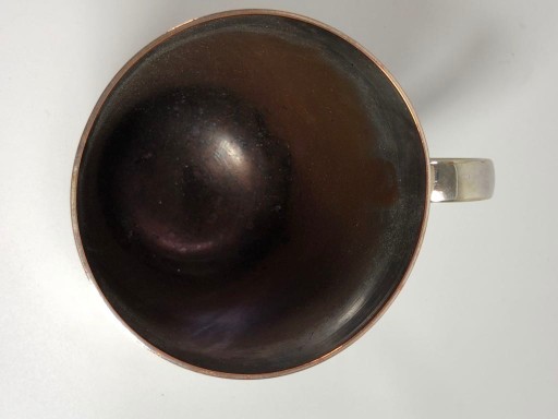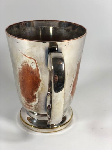 Piękny Angielski posrebrzany kufel, kubek. Połączenie miedzi z mosiądzem. Kubek o wzorze marynistycznym, szeroka, obciązona podstawa. Stan jak na zdjęciu - ubytek w srebrze. Sygnowanie widoczne na zdjęciu. Polecam