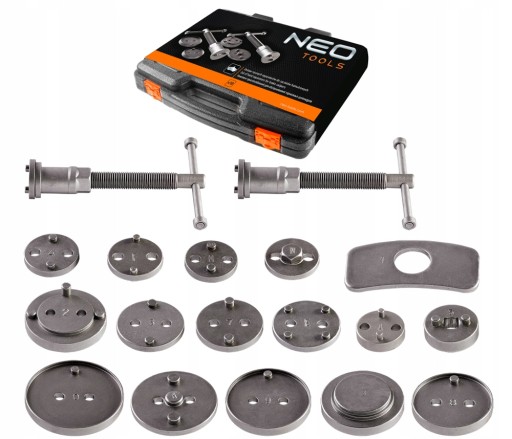 Zestaw separatorów do zacisków hamulcowych NEO składa się z 2-ręcznych prasek - prawo i lewoskrętnej oraz zestawu talerzyków. Umożliwia obsługę i wymianę tłoczków w zaciskach hamulcowych samochodów popularnych marek. Stanowi niezbędne wyposażenie każdego profesjonalnego serwisu samochodowego. Całość wykonana jest z wysokiej jakości stali i dostarczana w praktycznym pudełku z tworzywa sztucznego.